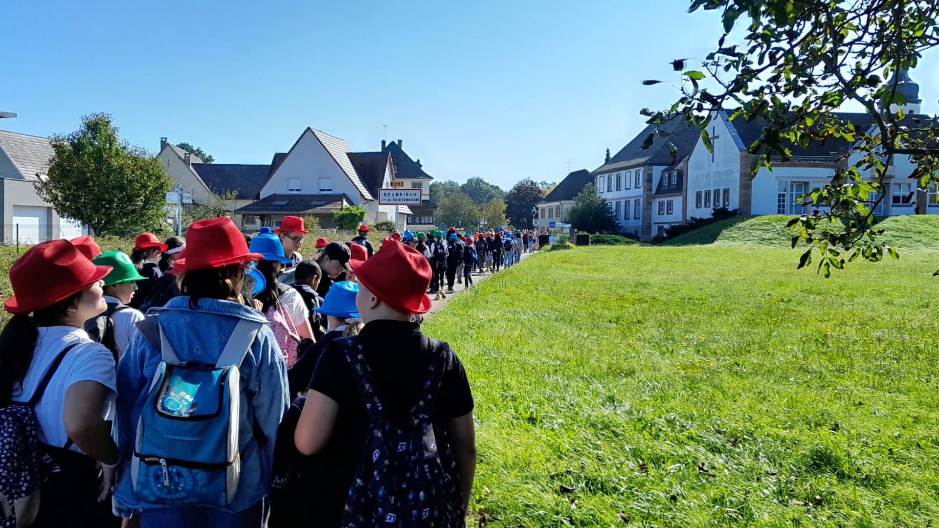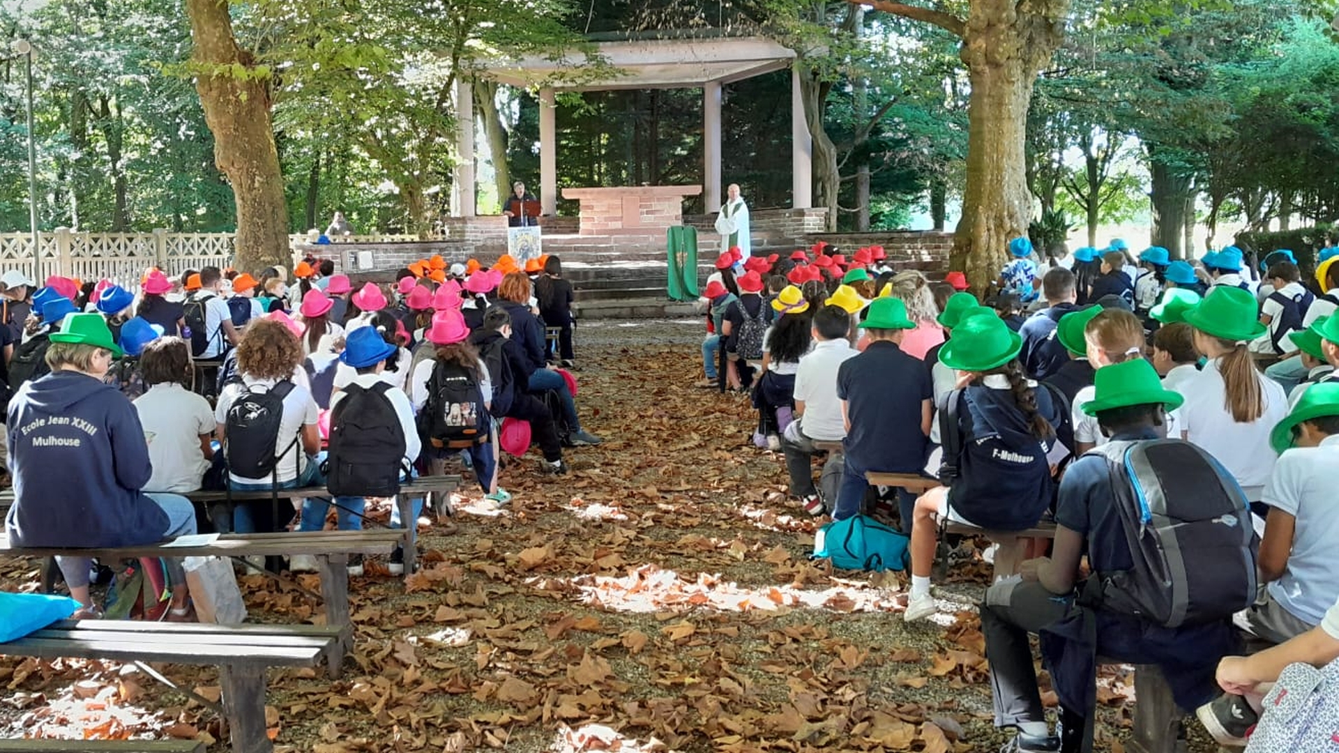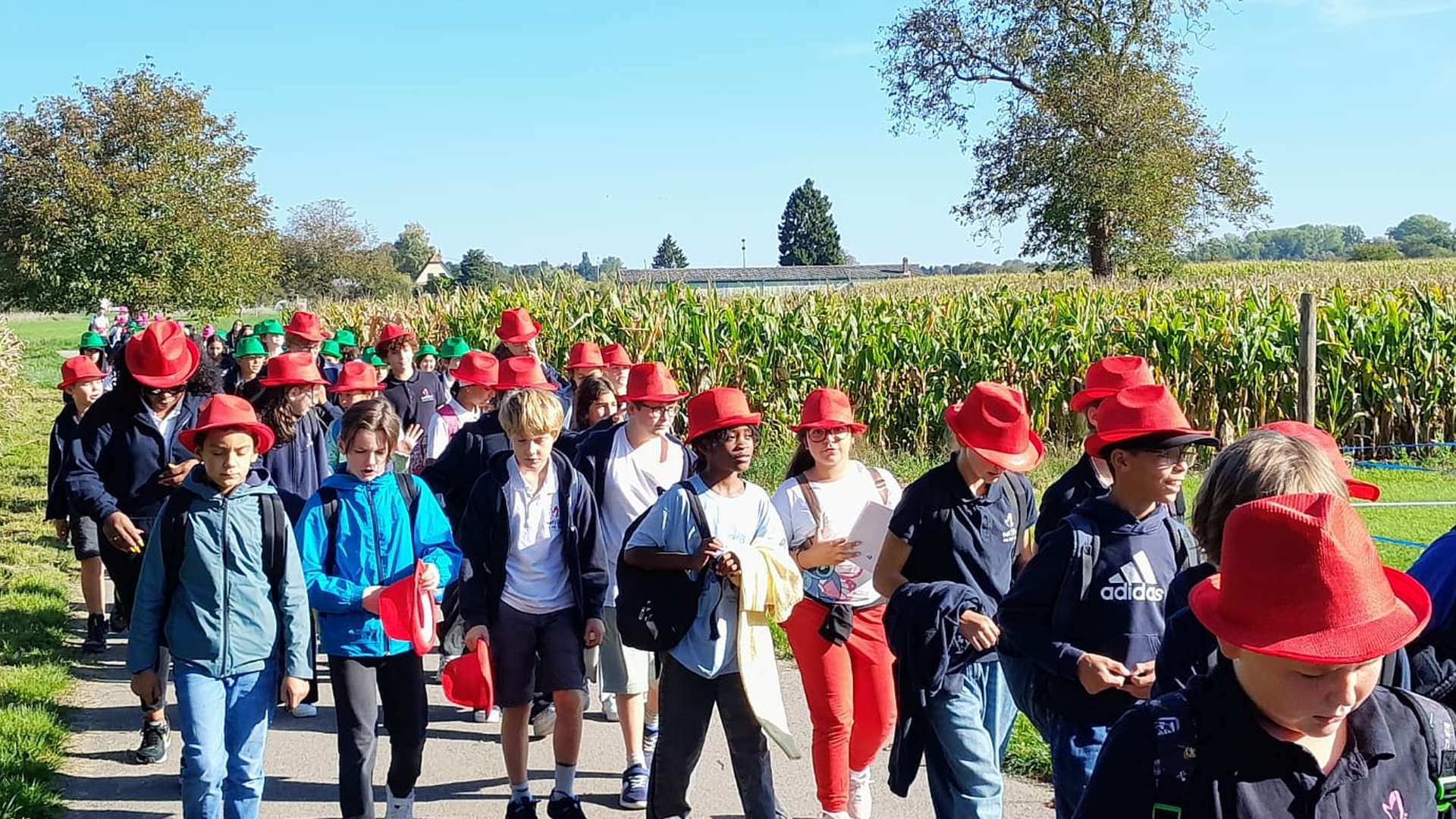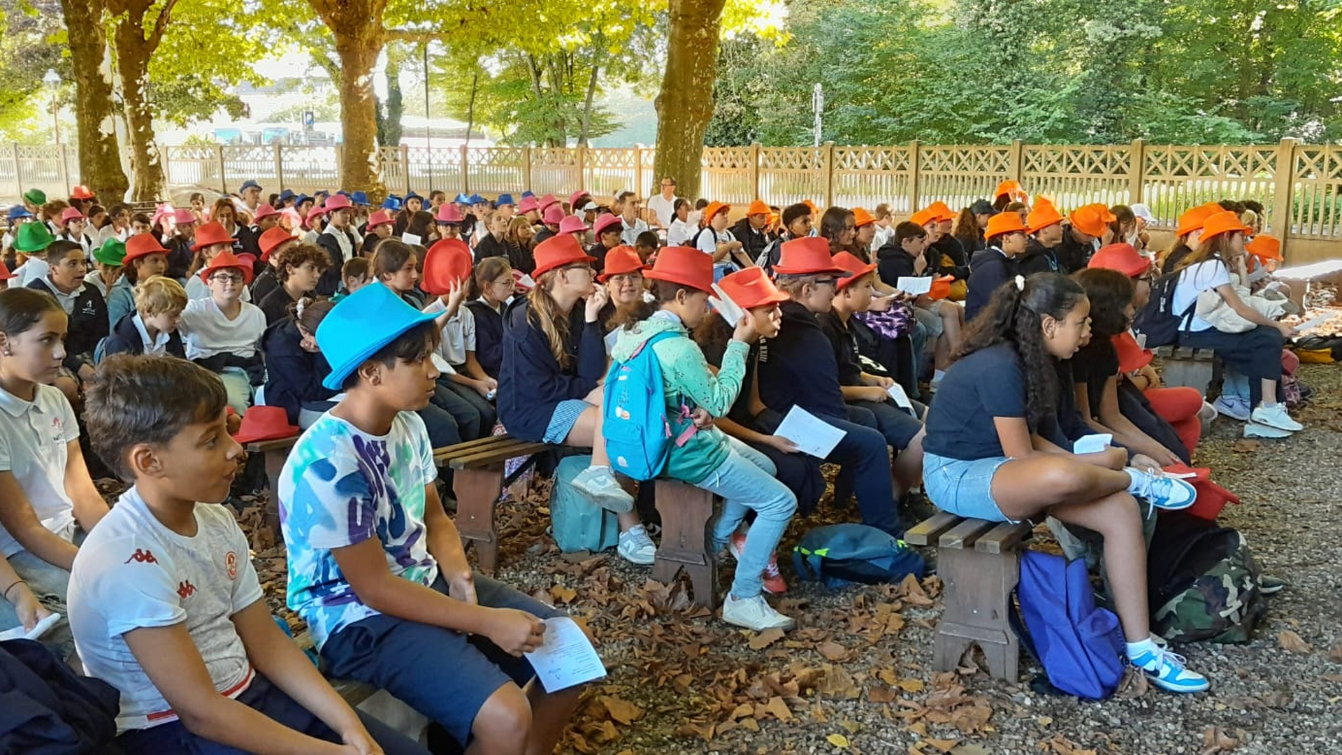 Pour mieux distinguer les classes et apprendre à se connaître, les élèves ont chacun reçu un bob de couleur selon leur classe d'appartenance. Au programme de cette journée où la troupe a miraculeusement évité les gouttes : marche, célébration en plein air sous les platanes - une véritable cathédrale de verdure - puis pique-nique et grand jeu de piste.