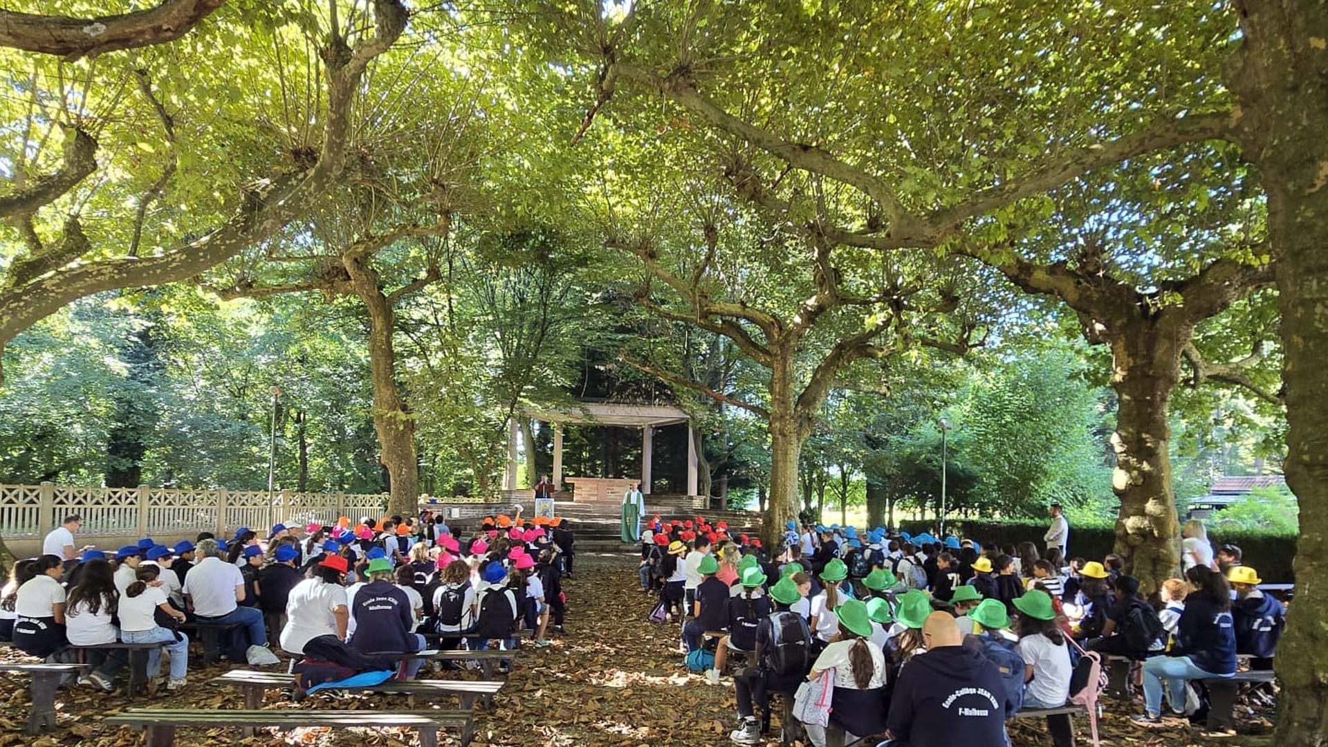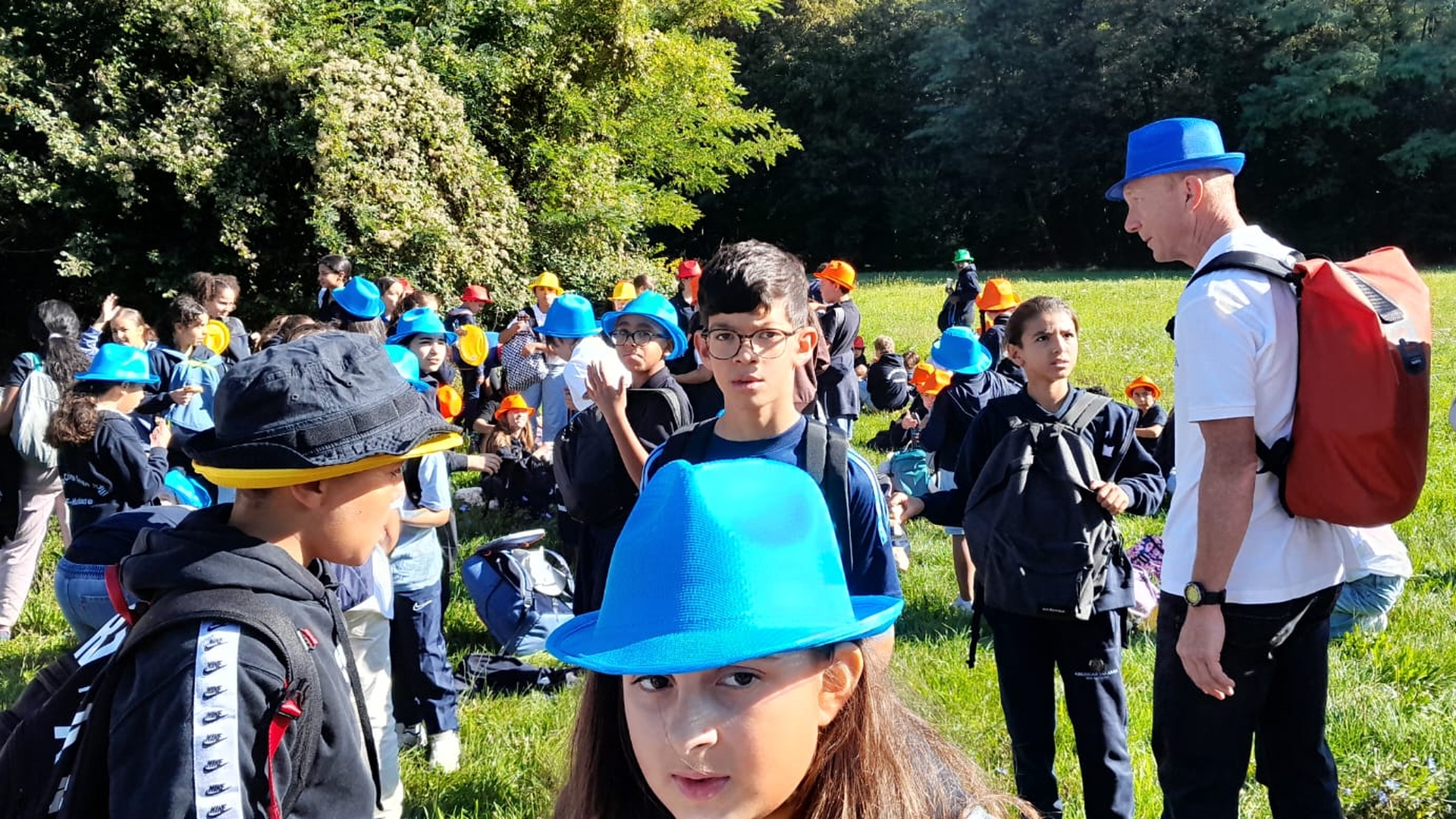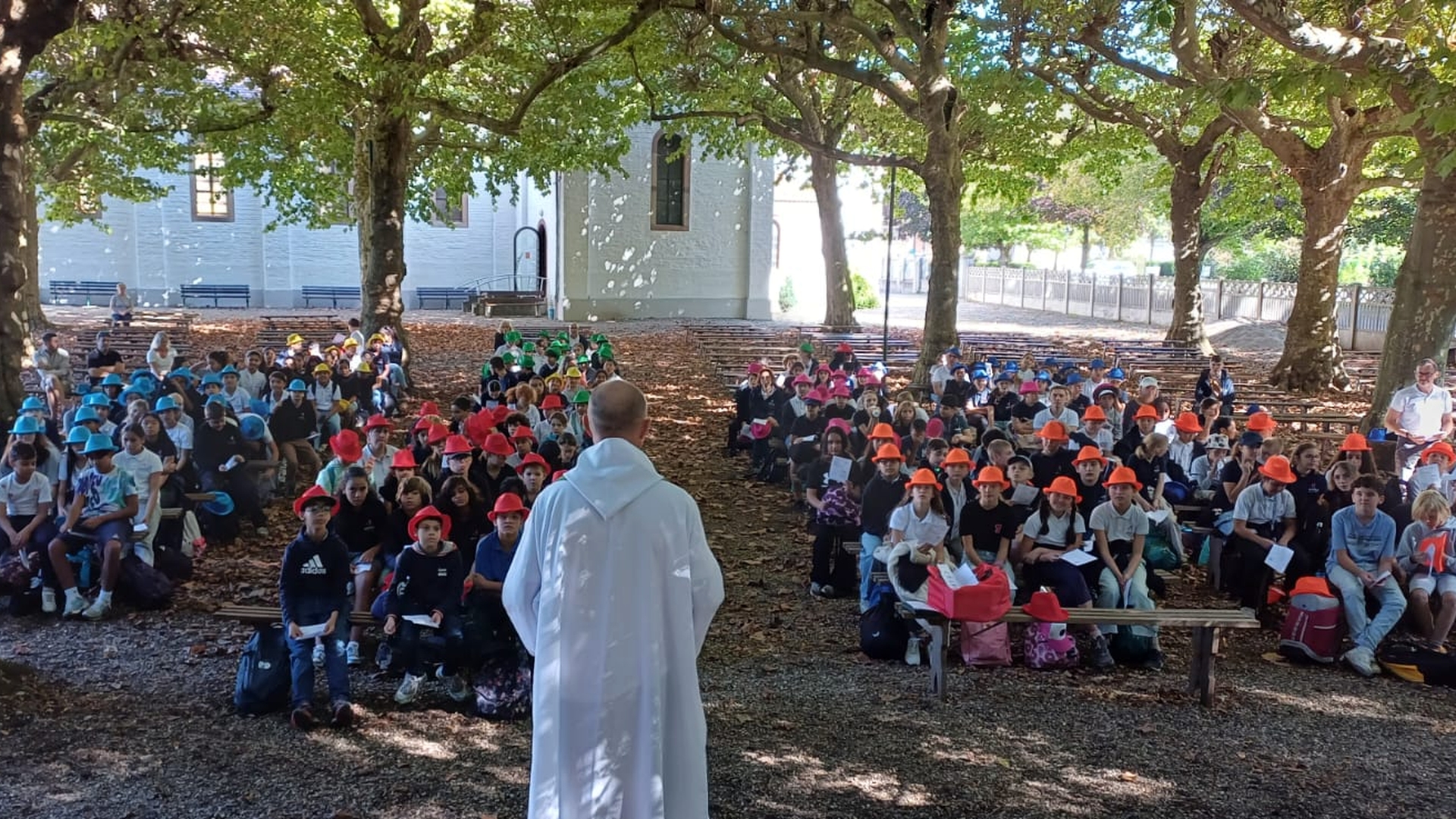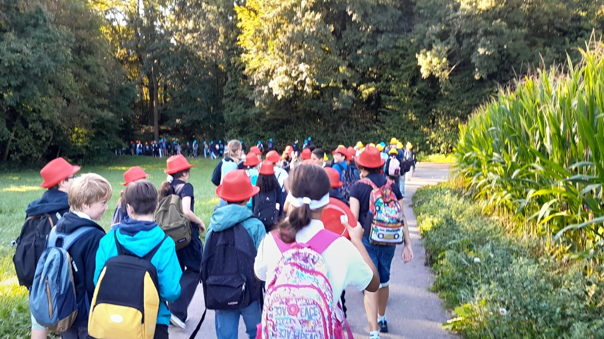 Pour mieux distinguer les classes et apprendre à se connaître, les élèves ont chacun reçu un bob de couleur selon leur classe d'appartenance. Au programme de cette journée où la troupe a miraculeusement évité les gouttes : marche, célébration en plein air sous les platanes - une véritable cathédrale de verdure - puis pique-nique et grand jeu de piste.