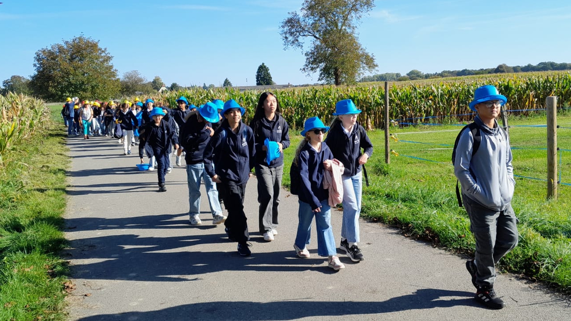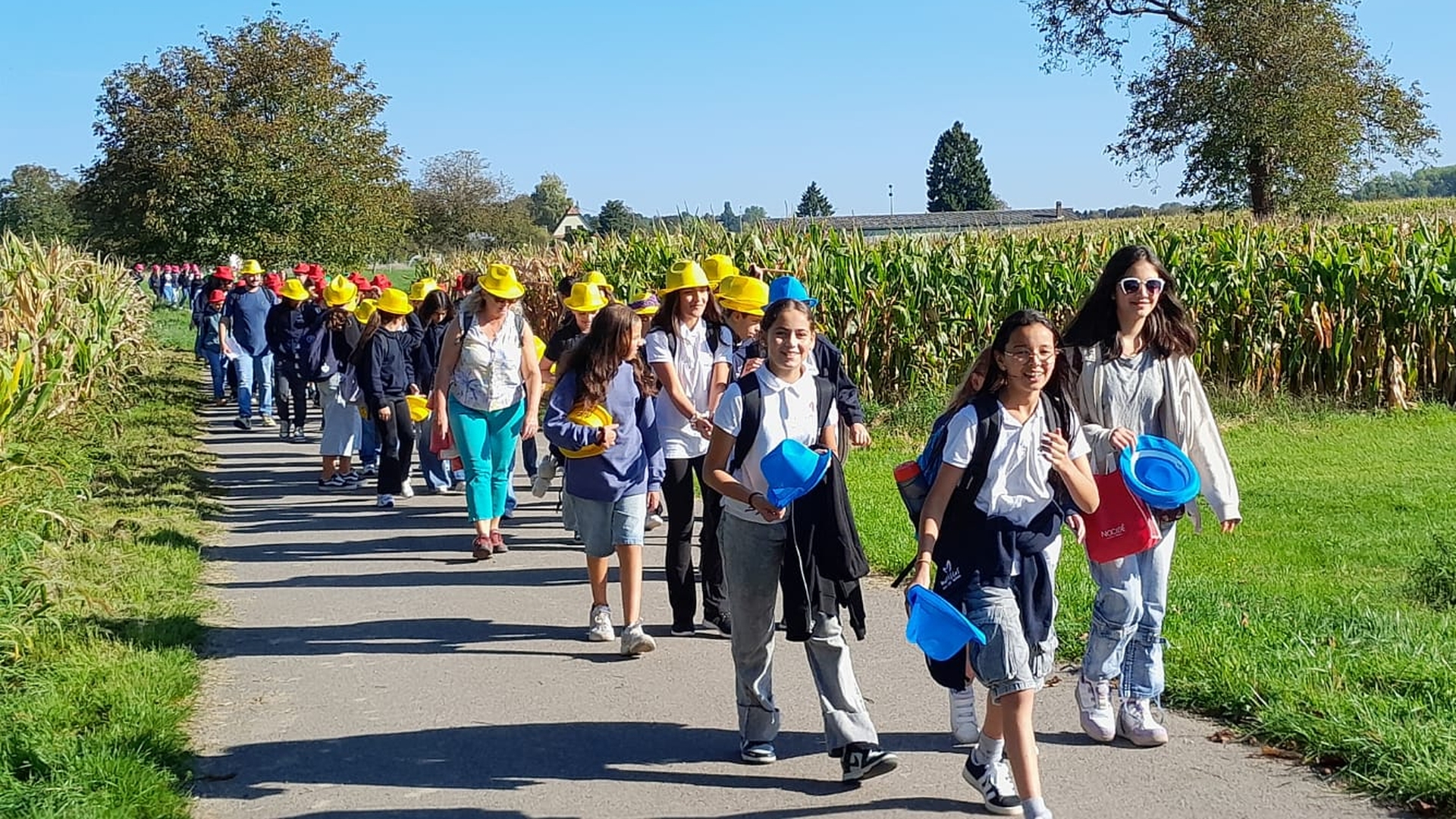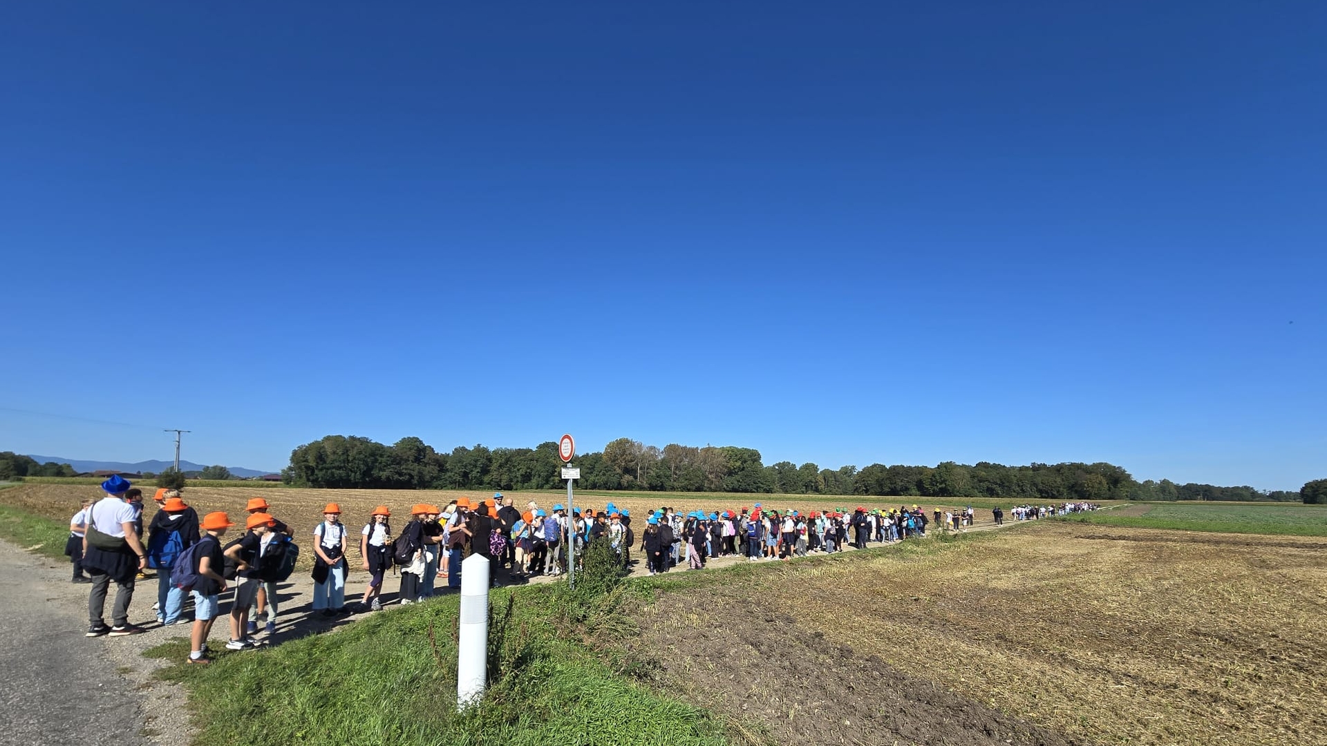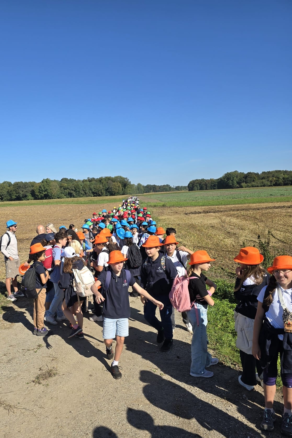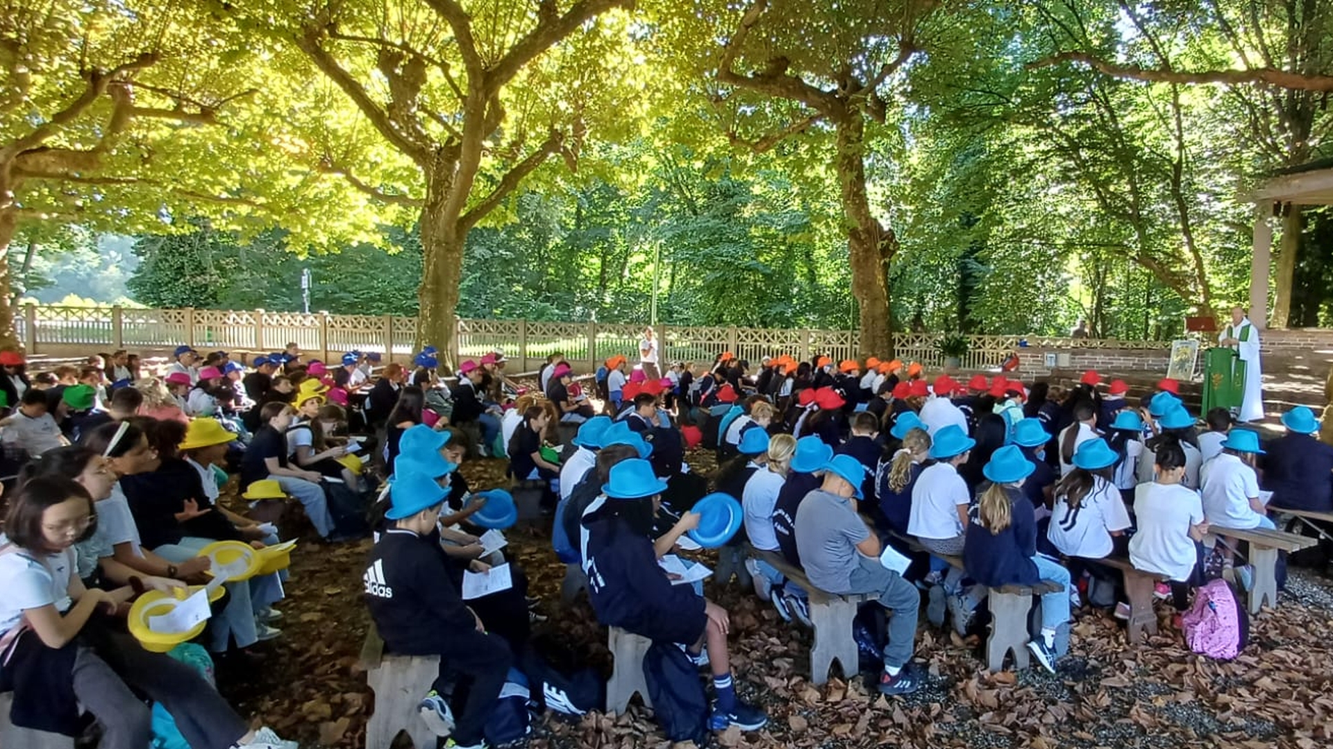 Pour mieux distinguer les classes et apprendre à se connaître, les élèves ont chacun reçu un bob de couleur selon leur classe d'appartenance. Au programme de cette journée où la troupe a miraculeusement évité les gouttes : marche, célébration en plein air sous les platanes - une véritable cathédrale de verdure - puis pique-nique et grand jeu de piste.