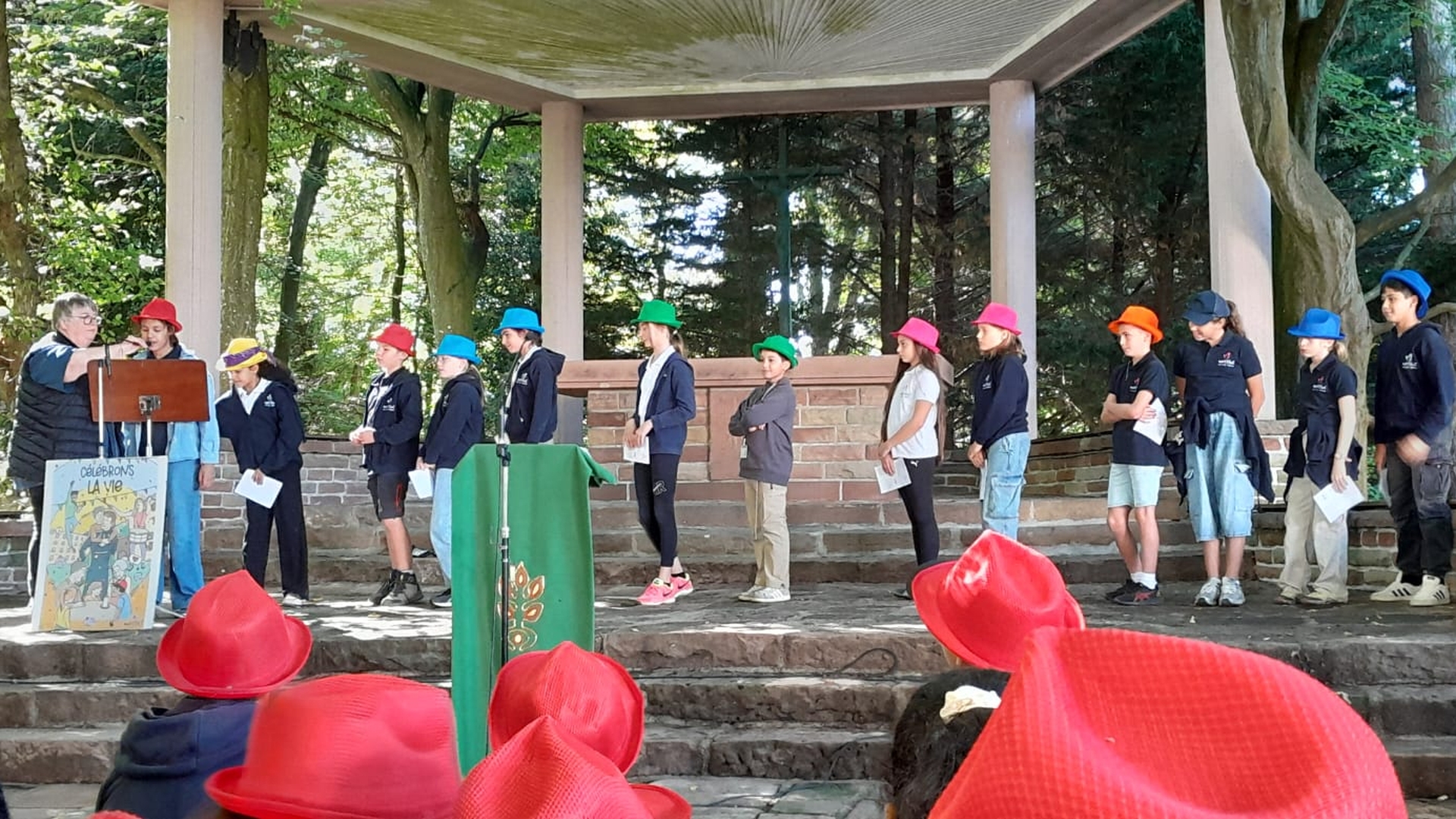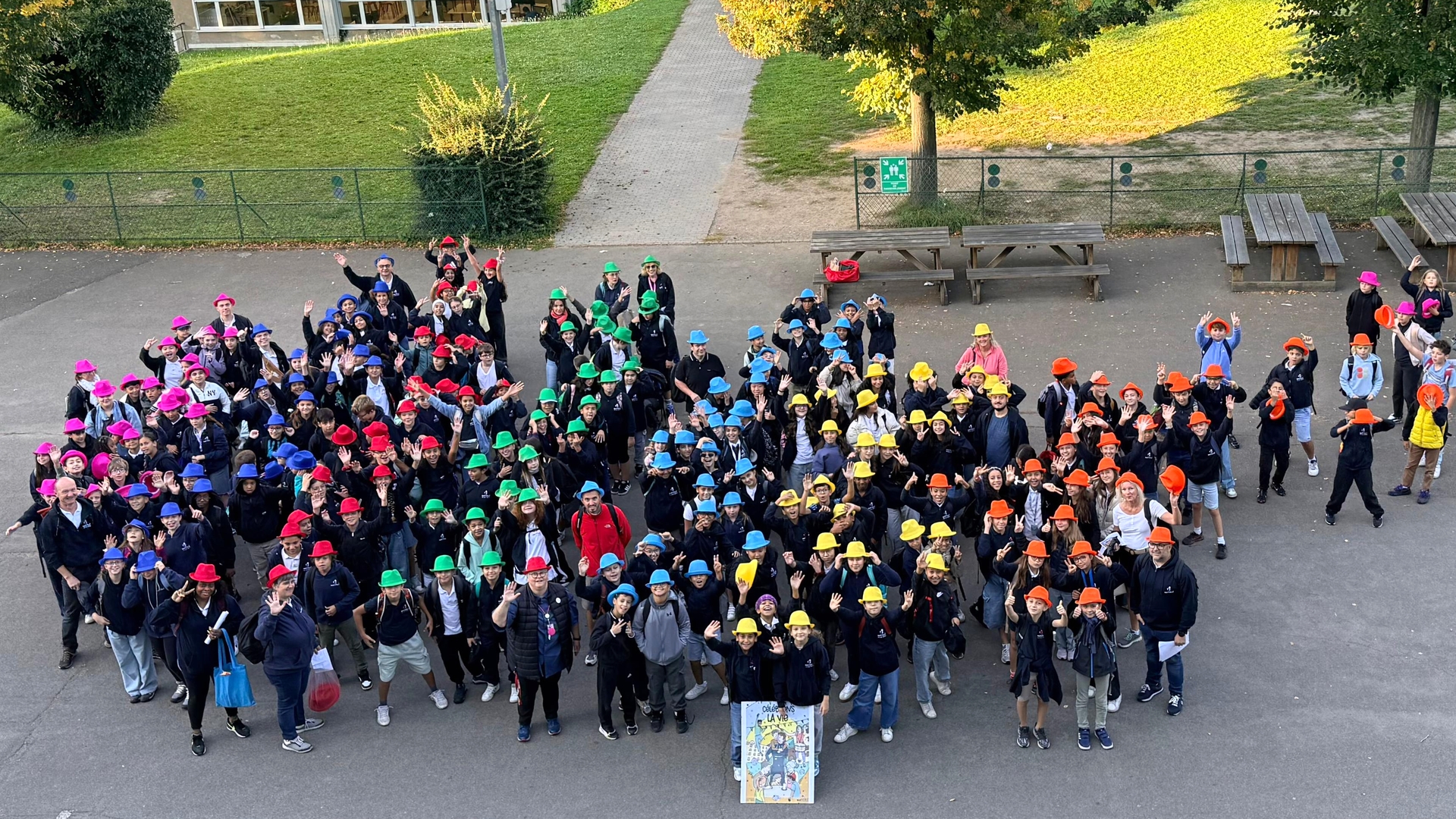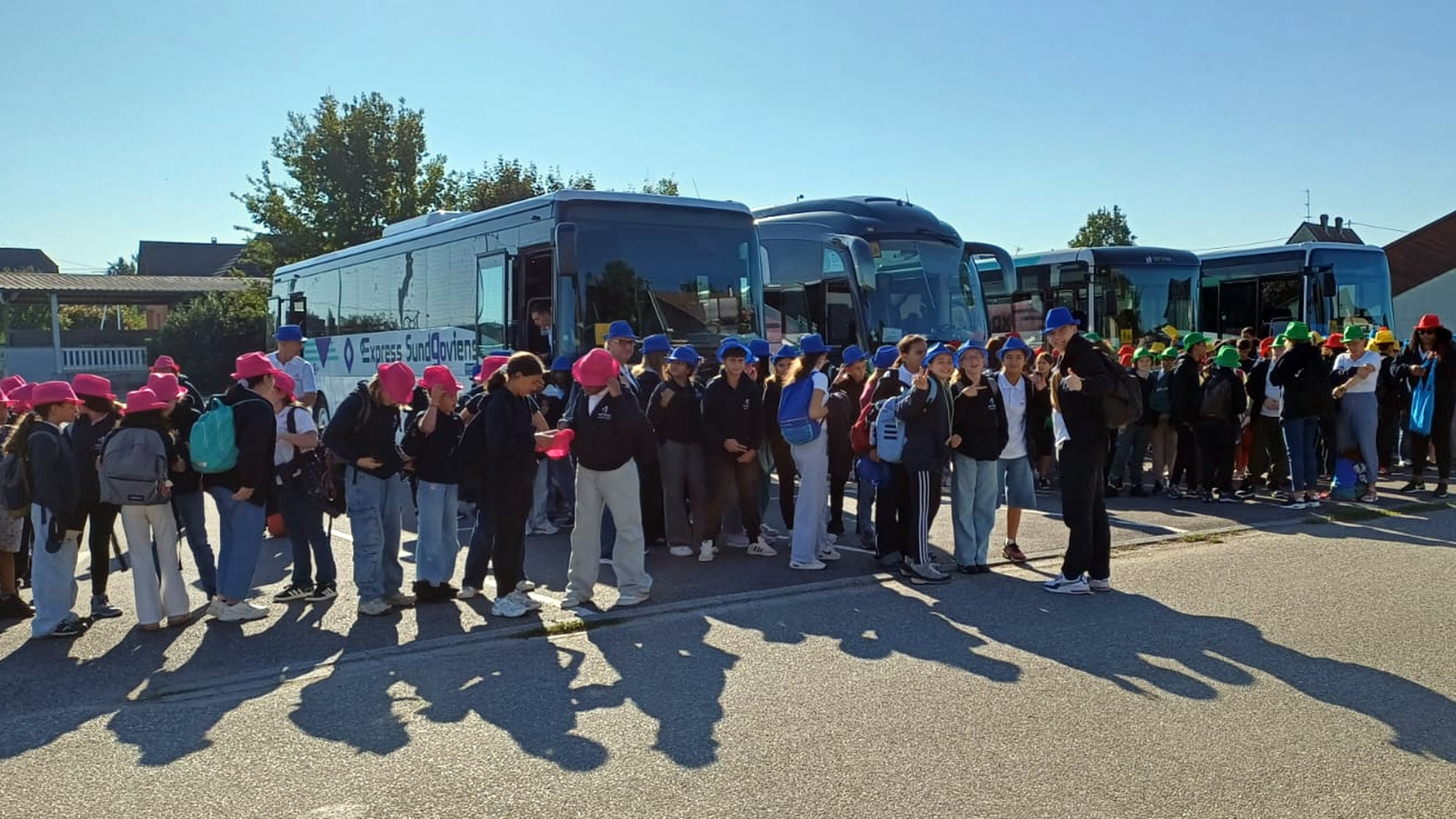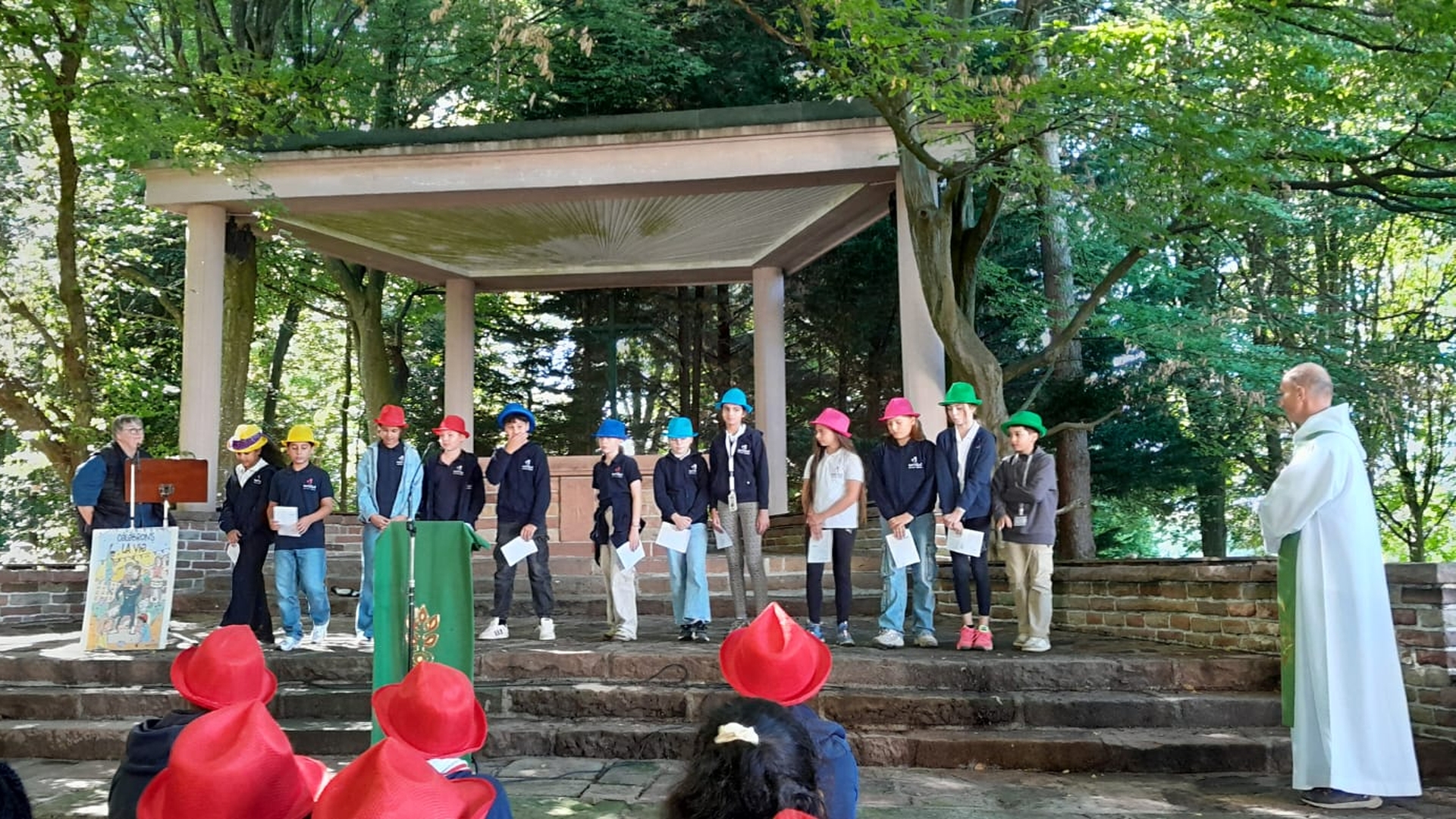 Pour mieux distinguer les classes et apprendre à se connaître, les élèves ont chacun reçu un bob de couleur selon leur classe d'appartenance. Au programme de cette journée où la troupe a miraculeusement évité les gouttes : marche, célébration en plein air sous les platanes - une véritable cathédrale de verdure - puis pique-nique et grand jeu de piste.