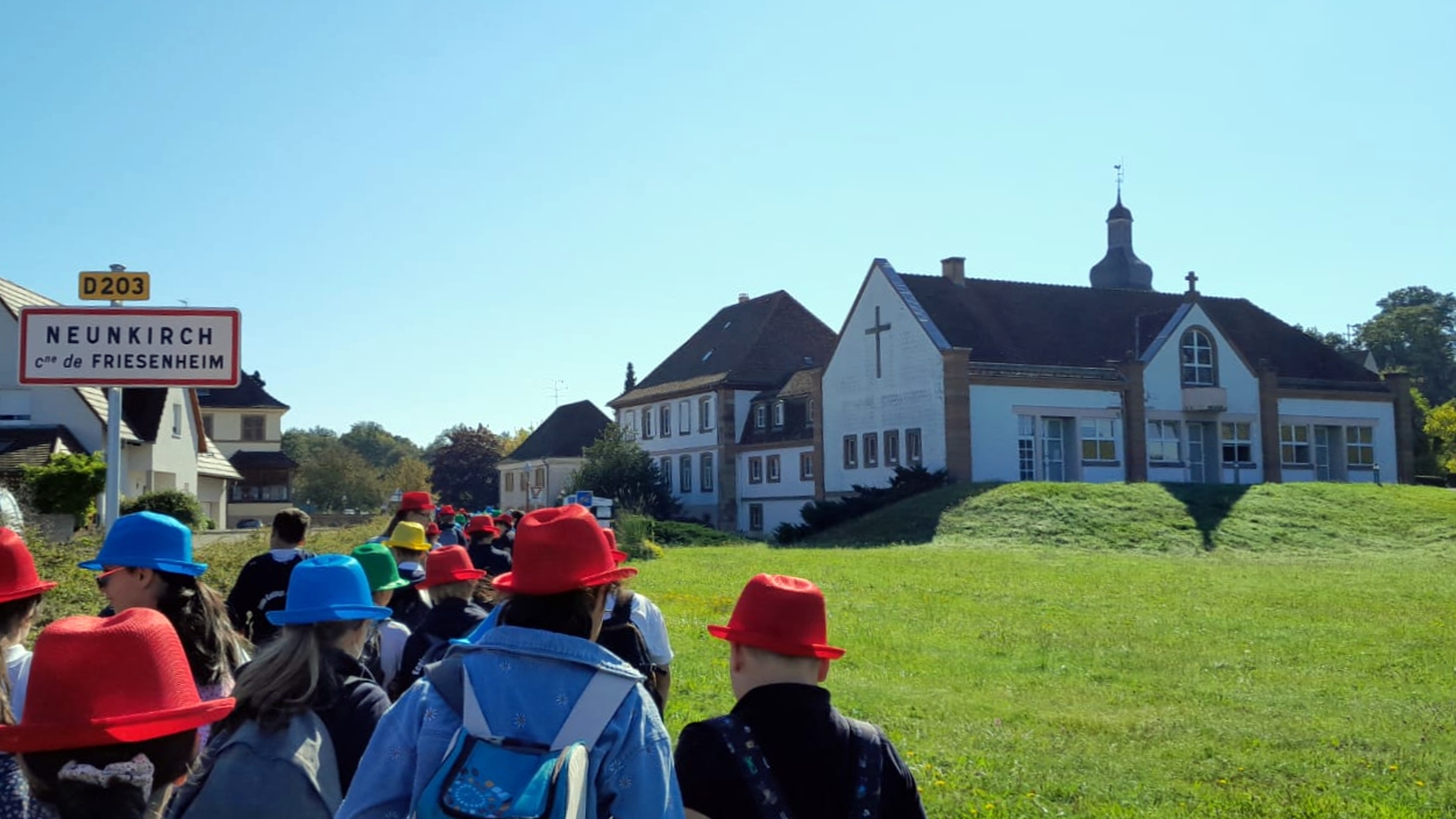 La traditionnelle journée de cohésion des sixièmes s'est déroulée cette année sous un magnifique ciel bleu à Neunkirch. Munis de leurs chapeaux colorés (une couleur par classe), les nouveaux collégiens, accompagnés de leurs professeurs principaux et de leurs professeurs de culture religieuse, ont pris la route du petit village bas-rhinois à travers champs. Arrivés à la Chapelle multiséculaire, ils ont assisté à une célébration en plein air assurée par le Père Iulian, prêtre référent de l'établissement, en présence de M. Fournier, chef d'établissement, M. Huntzinger, directeur-adjoint et de Mme Hassler, adjointe de direction pour la pastorale scolaire.