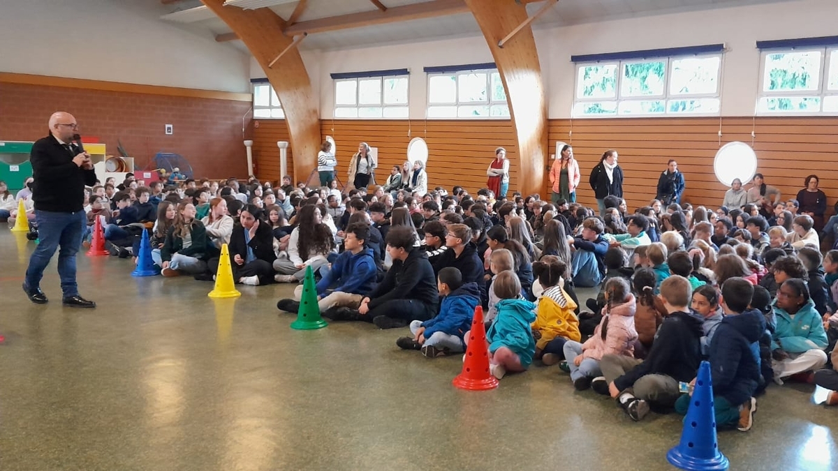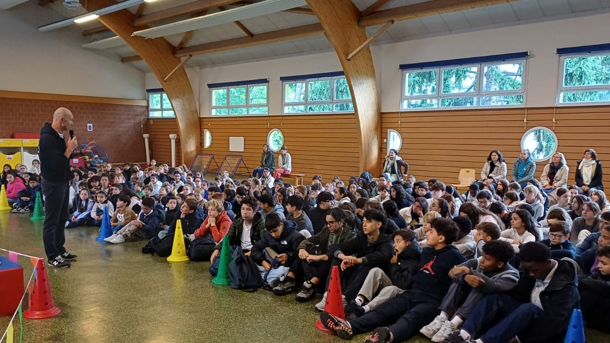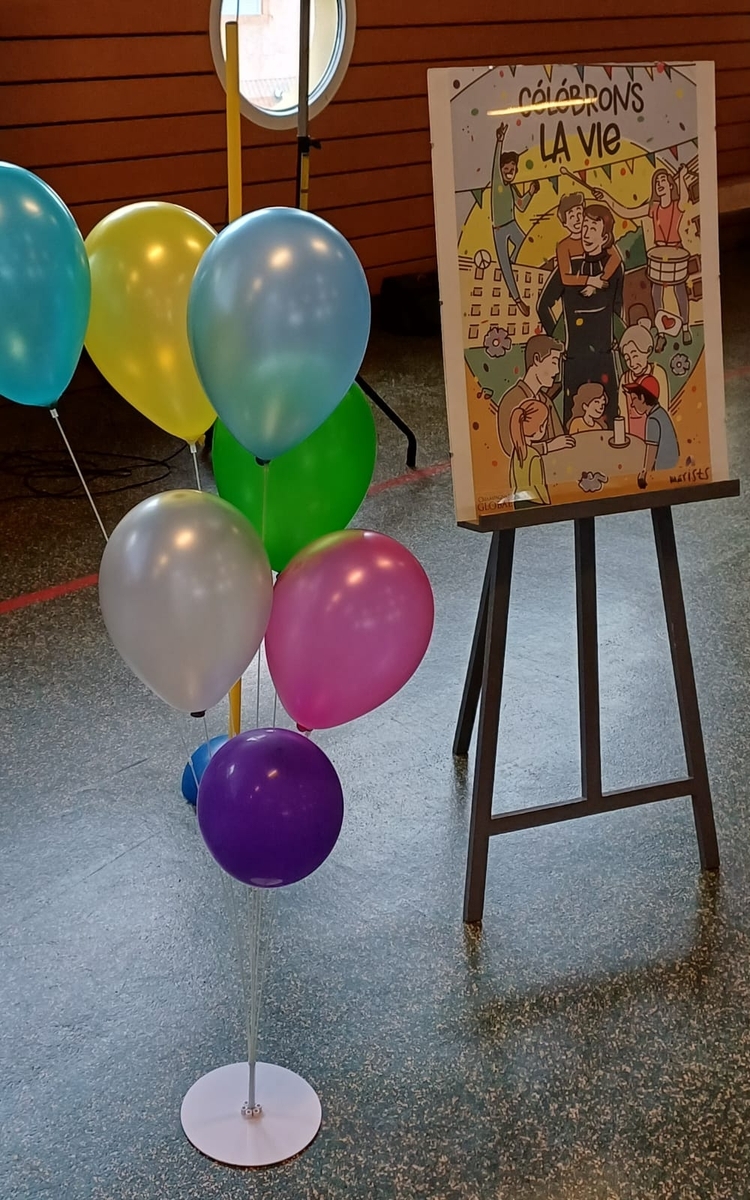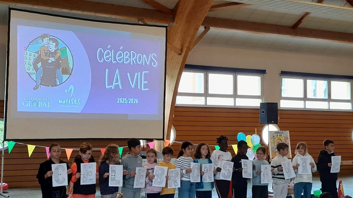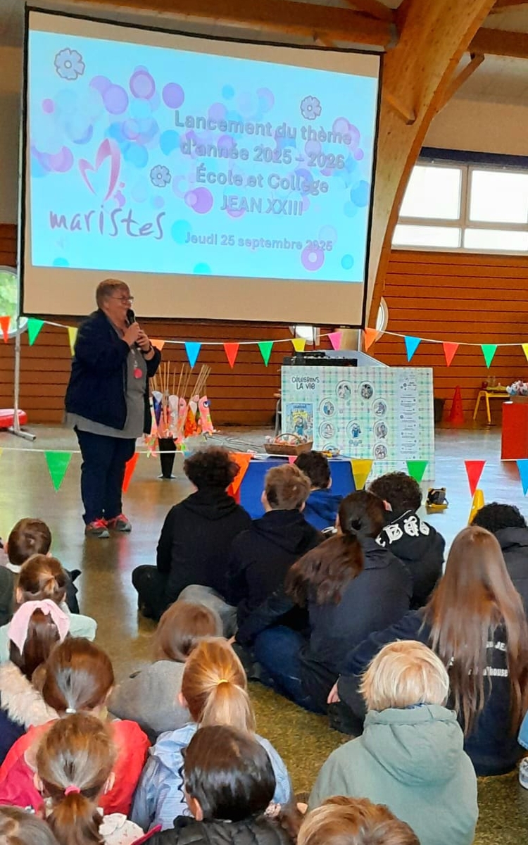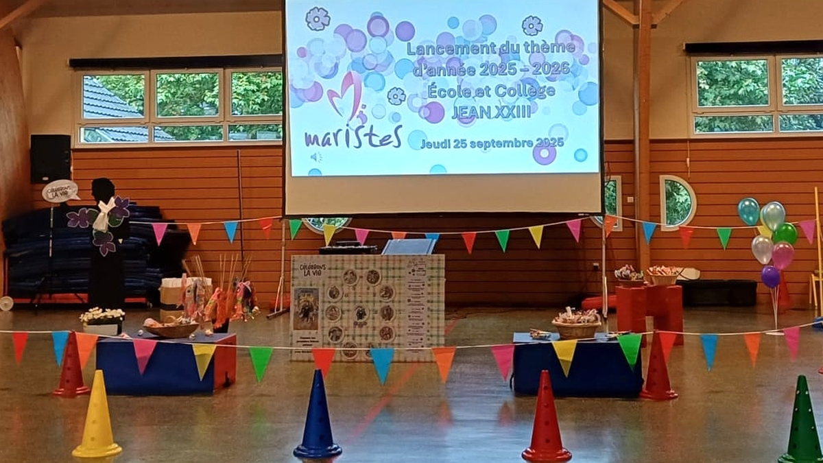 Le lancement du thème d’année, proposé par notre tutelle des Frères Maristes, a eu lieu sur toute une matinée pour tous les élèves de l’établissement par roulement : ils étaient conviés à une présentation de 20 minutes environ de l'affiche "CELEBRONS LA VIE" dans le gymnase du bâtiment Mangin (école primaire). Les symboles et les actions de l'année ont été explicitées par Elisabeth Hassler, adjointe de direction pour la pastorale scolaire, en présence de Iulian, notre prêtre référent, ainsi que des directions de l'école et du collège.